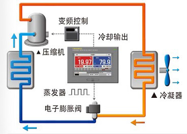 以加熱·冷卻輸出控制變頻器與調(diào)節(jié)電子膨脹閥,控制各區(qū)間的冷媒量 來調(diào)節(jié)被浪費的加熱量及控制冷凍機來實現(xiàn)節(jié)能。(變頻控制為選項) |