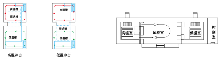 | 兩廂設(shè)備區(qū)分為高溫區(qū)和低溫區(qū)兩部分,測試產(chǎn)品置于提籃中,沖擊時提籃將測試產(chǎn)品 | ||